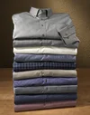 Multiple women's blouses displayed on corrugated metal for a retail catalog product photo.