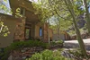Large, covered wood deck with corrugated steel roof and side-rails custom-built by Gary Foutch, Colorado Custom Trim. Featuring black steel joinery and redwood decking.  Log furniture from Cabela's; Homecrest Andover Spring Base outdoor chairs