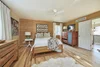 Large, covered wood deck with corrugated steel roof and side-rails custom-built by Gary Foutch, Colorado Custom Trim. Featuring black steel joinery and redwood decking.  Log furniture from Cabela's; Homecrest Andover Spring Base outdoor chairs in black; steel arc hammock stand by Hatteras Hammocks; cast iron chiminea by Aussie Heatwave; and, outdoor rug by Plow & Hearth. Cottonwood and beetle kill pine side tables by homeowner.